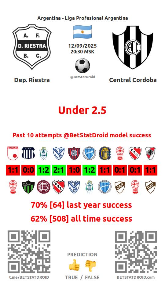 ✔ Dep. Riestra lost under 2,5 goals in each of 16 last games