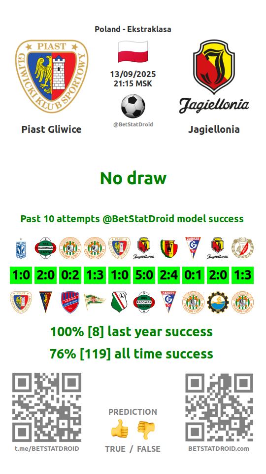 ✔ Piast Gliwice scores under 1,5 goals in each of 6 last games