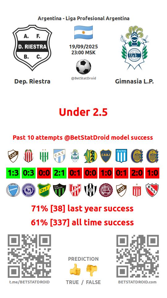 ✔ Dep. Riestra lost under 2,5 goals in each of 17 last games