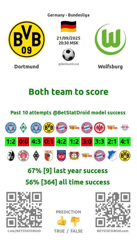 ✔ Wolfsburg scores under 1,5 goals in each of 10 last games