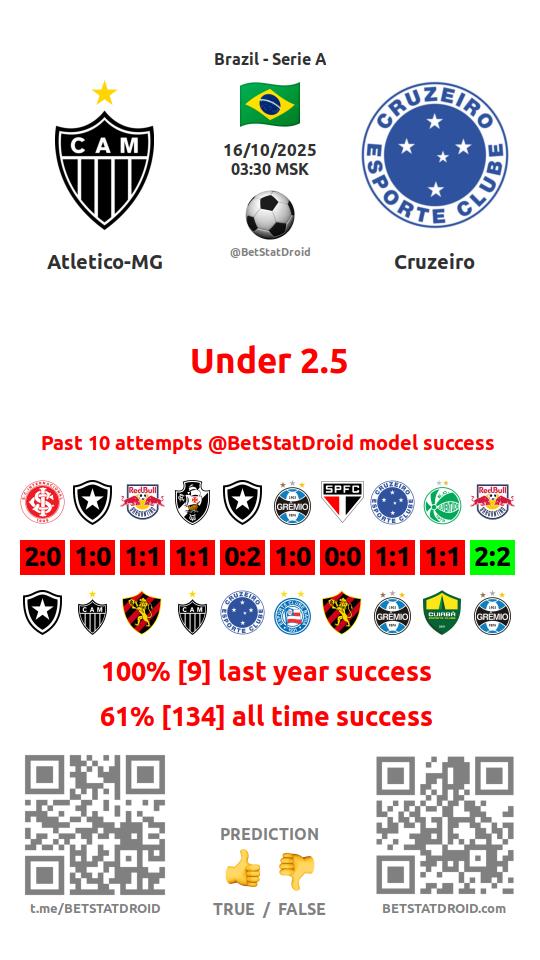 ✔ Cruzeiro lost under 2,5 goals in each of 25 last games