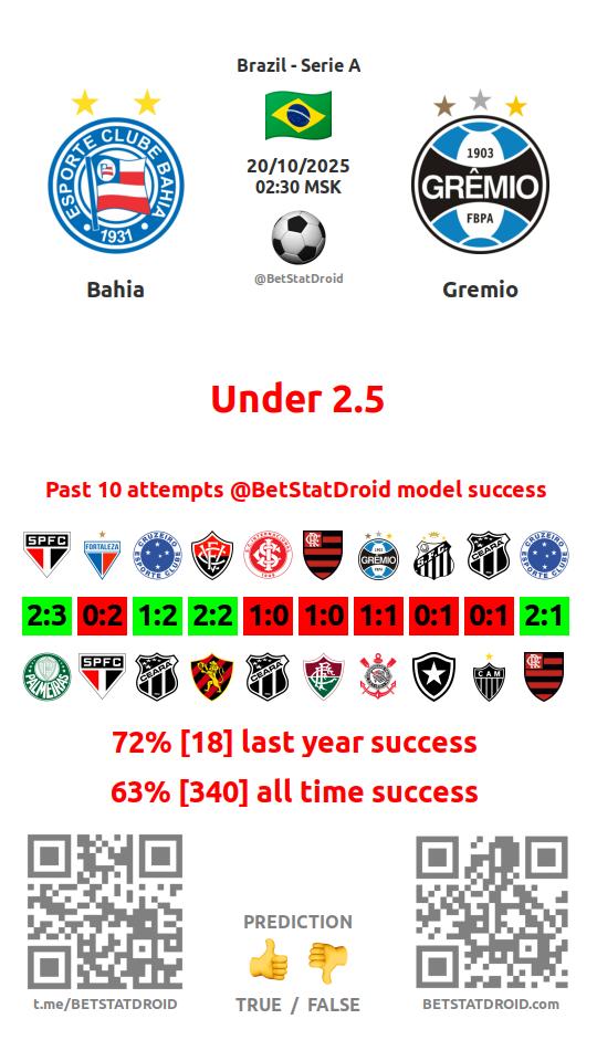 ✔ Bahia scores under 2,5 goals in each of 10 last games