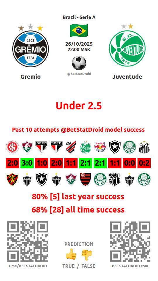 ✔ Juventude scores under 2,5 goals in each of 15 last games