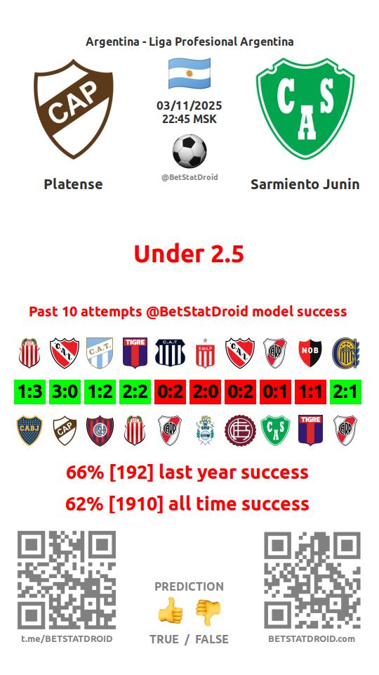 ✔ Sarmiento Junin scores under 2,5 goals in each of 60 last games