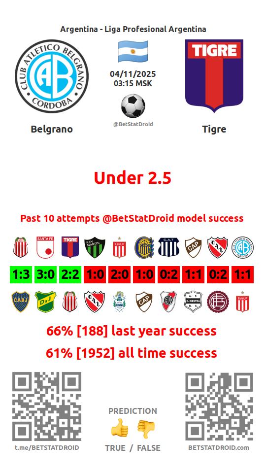 ✔ Belgrano scores under 2,5 goals in each of 8 last games