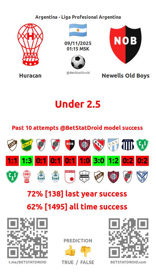 ✔ Huracan scores under 2,5 goals in each of 8 last games