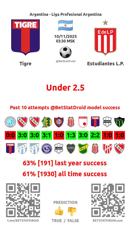 ✔ Tigre scores under 2,5 goals in each of 25 last games