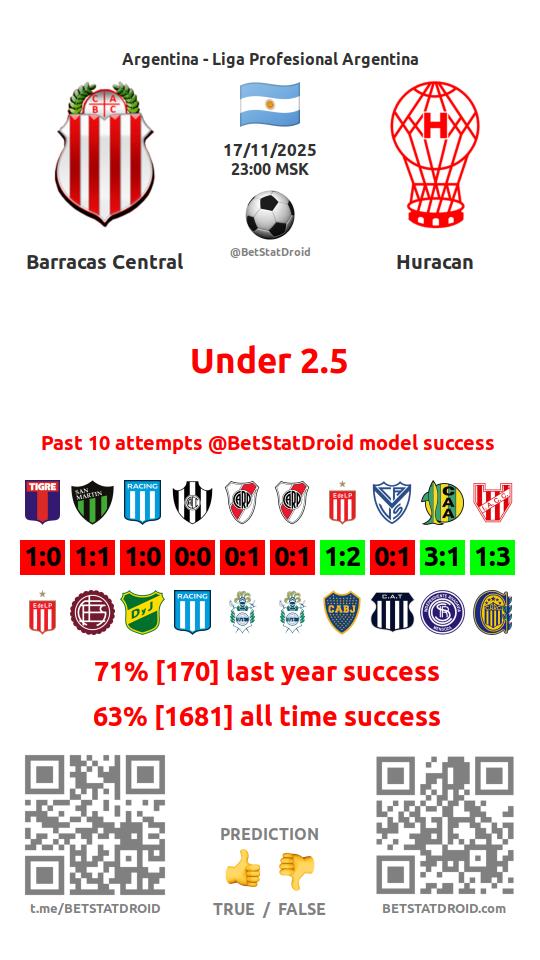 ✔ Barracas Central scores under 2,5 goals in each of 11 last games