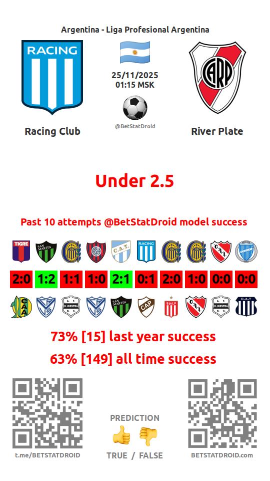 ✔ Racing Club scores under 2,5 goals in each of 12 last games