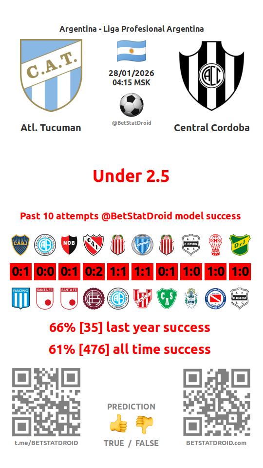 ✔ Atl. Tucuman lost under 2,5 goals in each of 15 last games