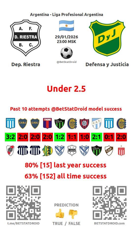 ✔ Dep. Riestra lost under 2,5 goals in each of 22 last games