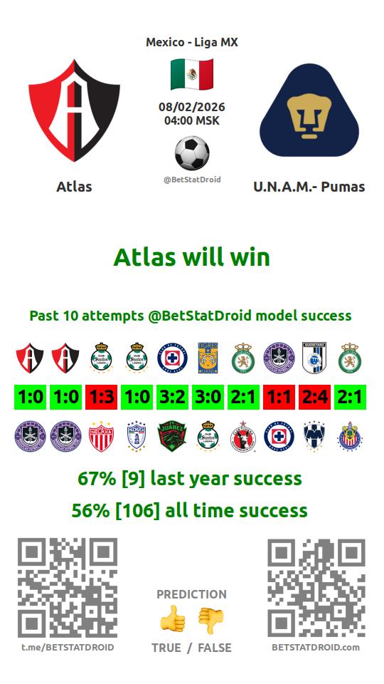 ✔ Atlas scores under 1,5 goals in each of 11 last games