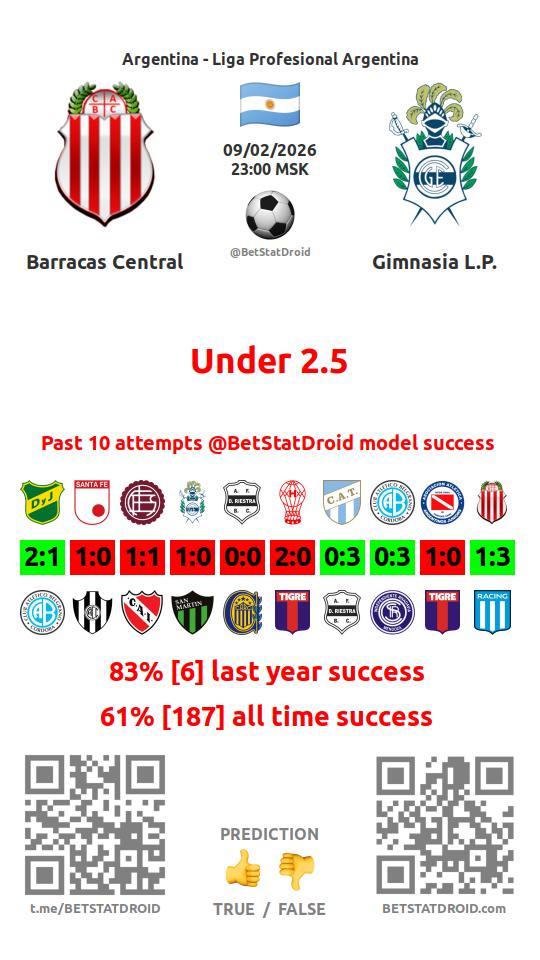 ✔ Barracas Central scores under 2,5 goals in each of 9 last games