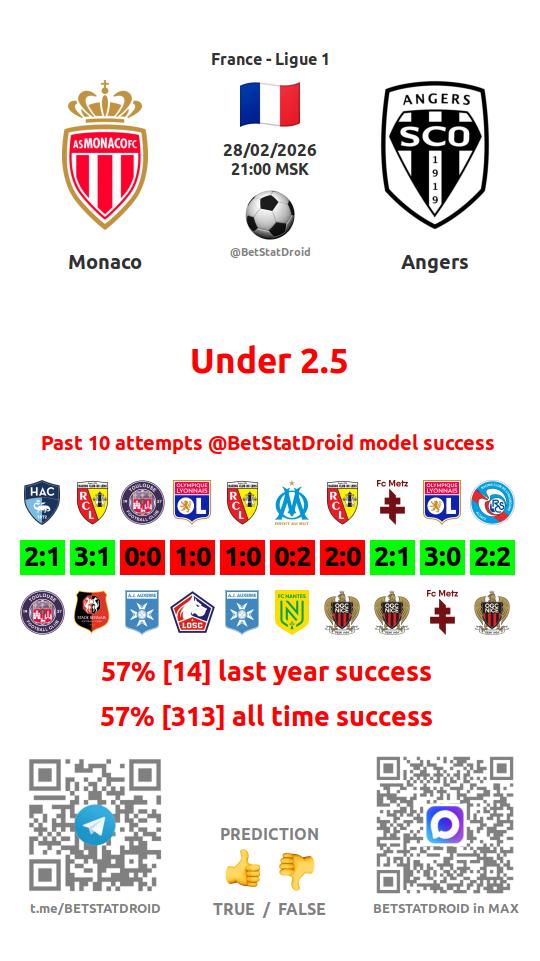 ✔ Angers scores under 2,5 goals in each of 16 last games
