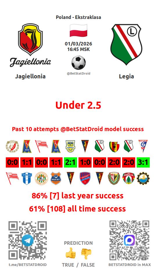 ✔ Jagiellonia scores under 2,5 goals in each of 26 last games