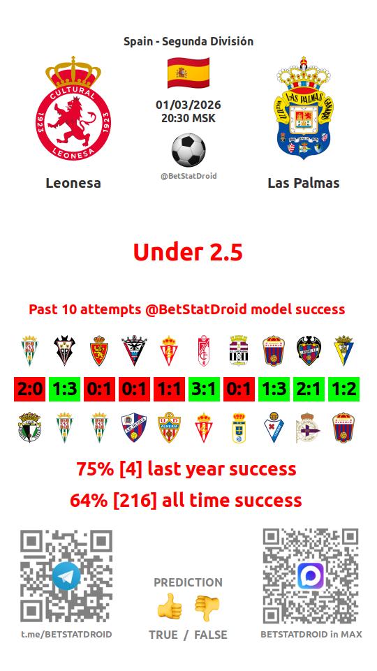 ✔ Leonesa scores under 2,5 goals in each of 15 last games