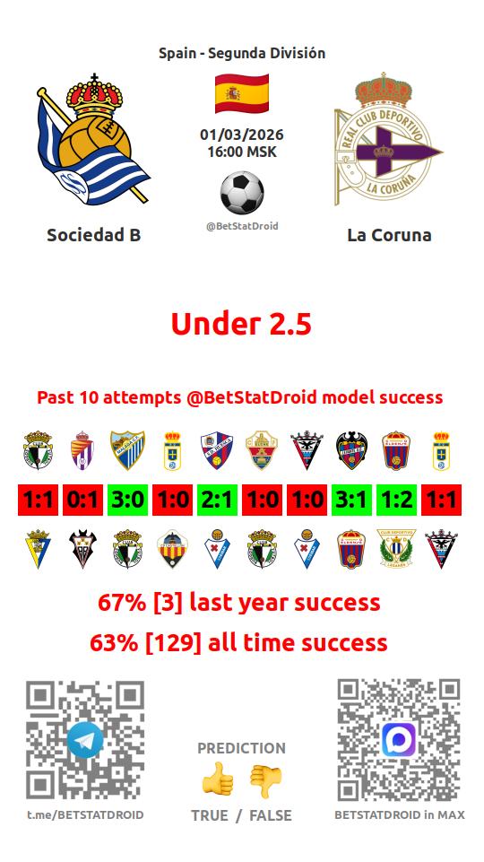 ✔ Sociedad B lost under 2,5 goals in each of 8 last games