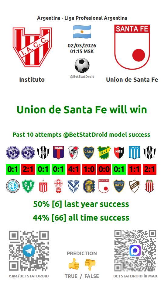 ✔ Instituto scores under 2,5 goals in each of 15 last games