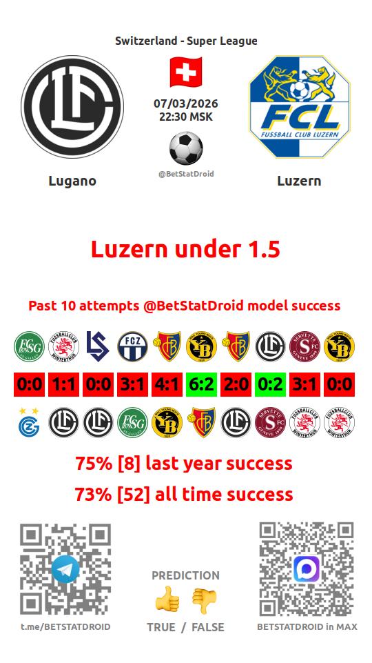 ✔ Lugano lost under 1,5 goals in each of 5 last games