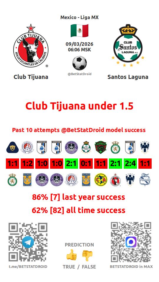 ✔ Club Tijuana lost under 2,5 goals in each of 9 last games