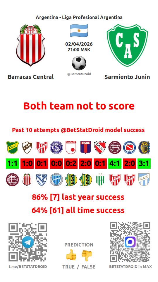 ✔ Barracas Central lost under 1,5 goals in each of 6 last games