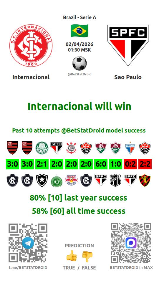 ✔ Internacional lost under 1,5 goals in each of 5 last games