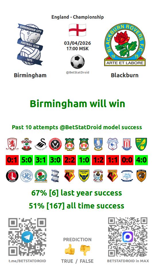 ✔ Birmingham scores under 1,5 goals in each of 6 last games