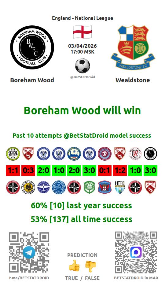 ✔ Boreham Wood scores in each of 4 last games