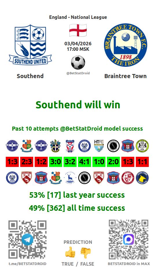 ✔ Braintree Town not scores in each of 3 last games