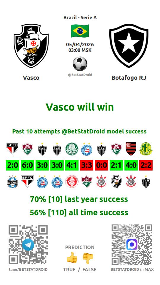 ✔ Vasco scores under 1,5 goals in each of 6 last games
