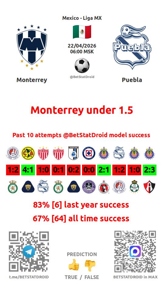 ✔ Puebla scores under 1,5 goals in each of 7 last games