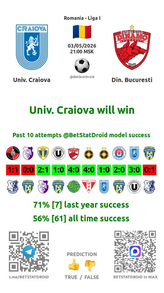 ✔ Univ. Craiova scores under 2,5 goals in each of 8 last games