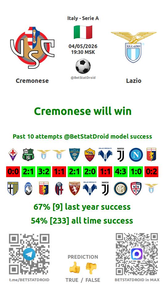 ✔ Cremonese scores under 2,5 goals in each of 21 last games
