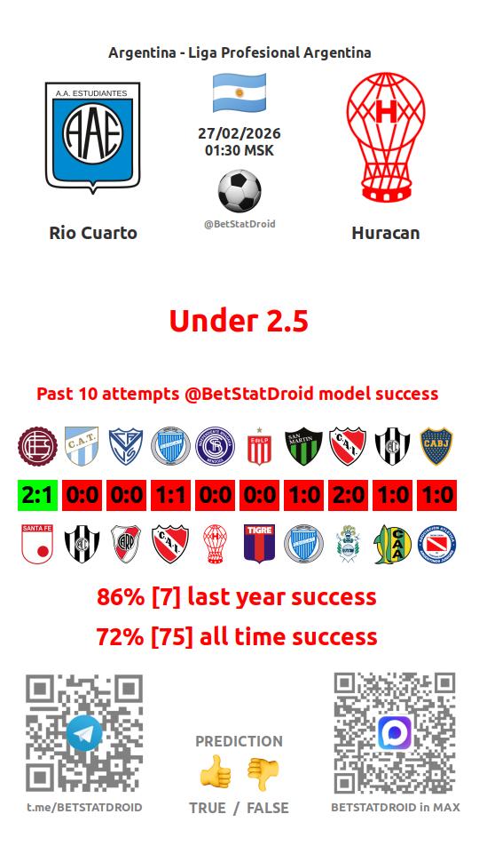 ✔ Huracan scores under 2,5 goals in each of 10 last games
