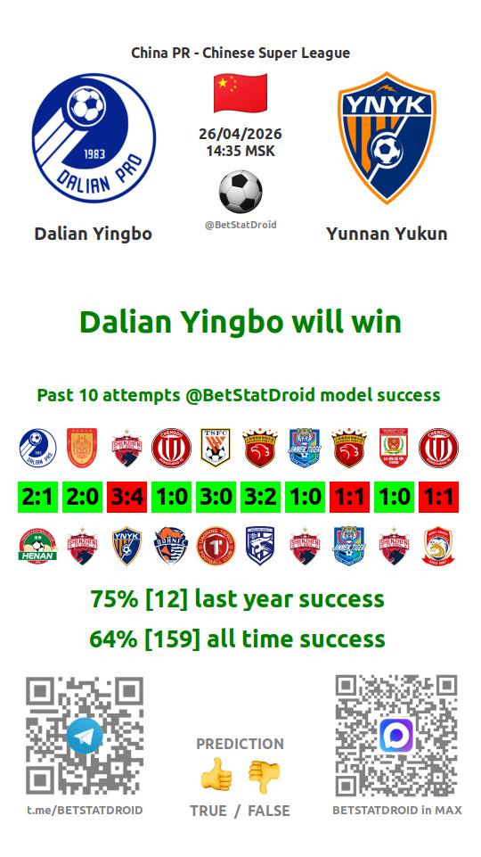 ✔ Dalian Yingbo lost under 2,5 goals in each of 12 last games