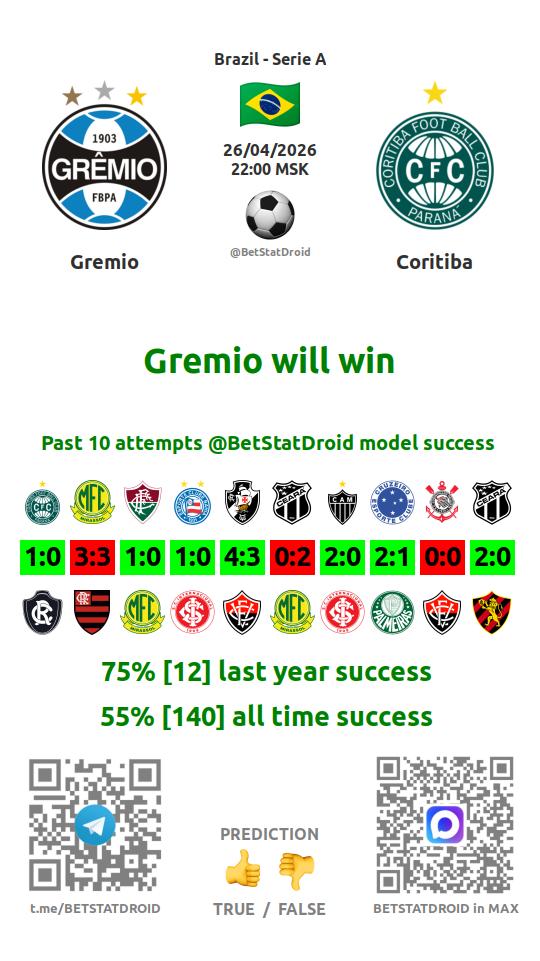 ✔ Gremio lost under 2,5 goals in each of 11 last games