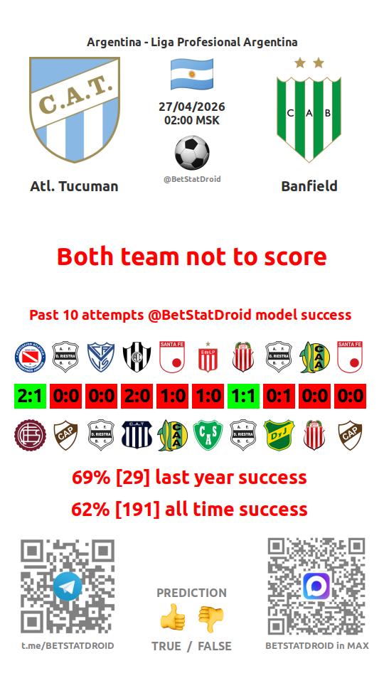 ✔ Atl. Tucuman scores under 1,5 goals in each of 8 last games